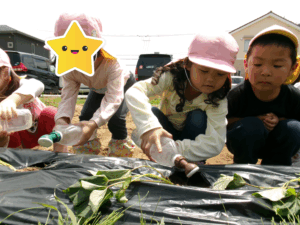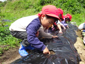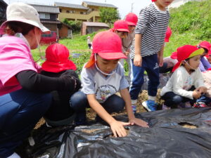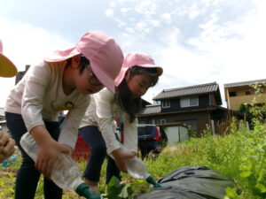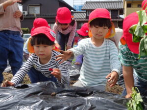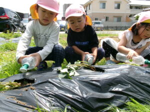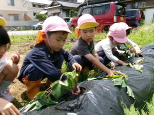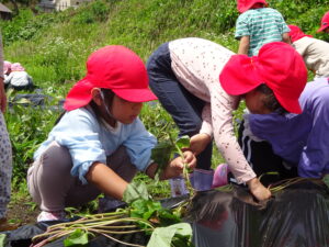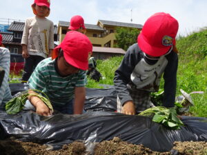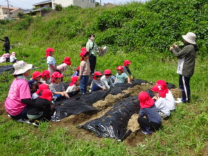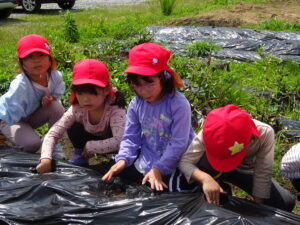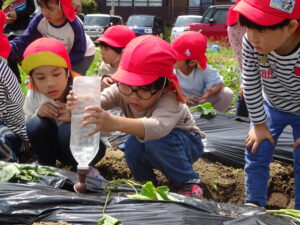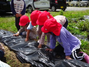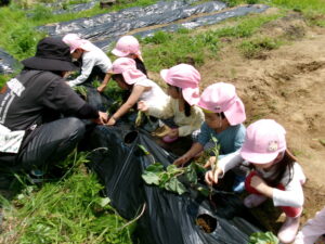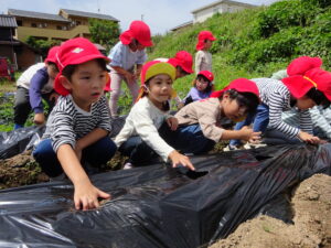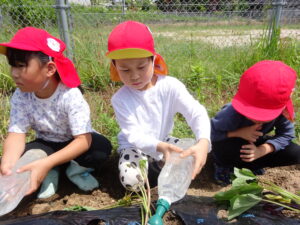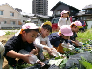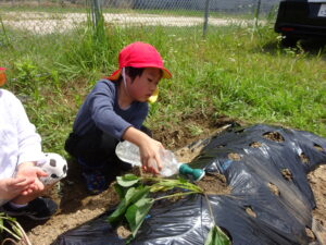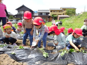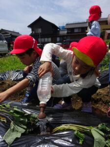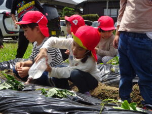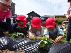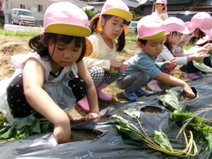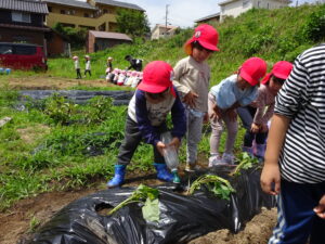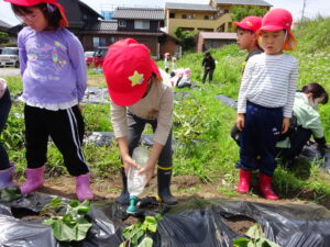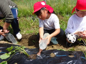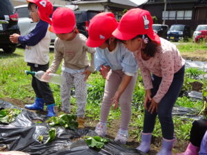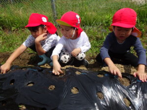 先月、さつまいもの苗を植えました🌱さつまいもを植えるうねは、奉仕作業の時にお家の方に手伝って作っていただきました。(ありがとうございました(^-^))先生のお話を聞きながら、さつまいもさんの長い苗を、寝かせるようにそっと植えました。「大きくなってね」と言いながら、たっぷりのお水もあげました。梅雨があっという間にあけ、カラカラの畑に毎日先生たちが朝と夕方、お水をあげてくれていますよ。おいしいおいもが育ちますように…🍠