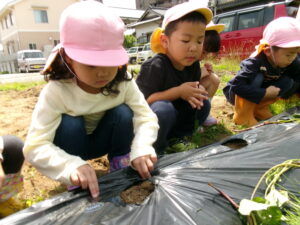 指で土を掘って、さつまいもを植える場所を作ります。
