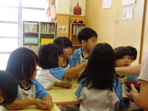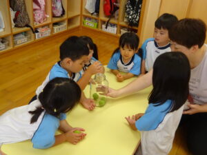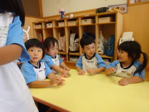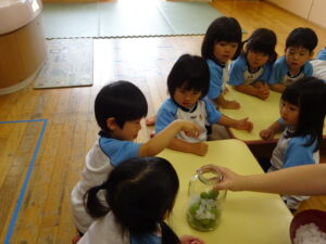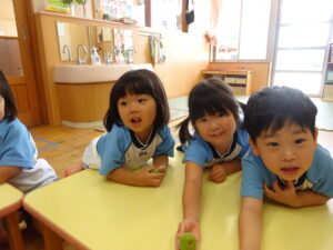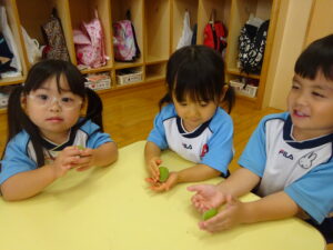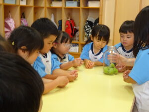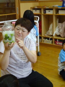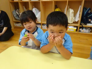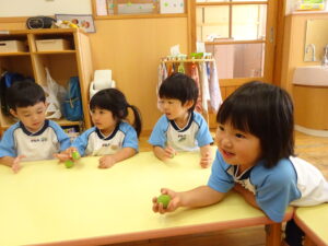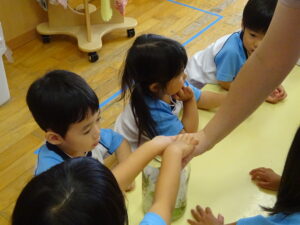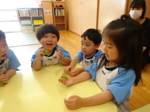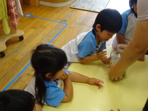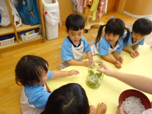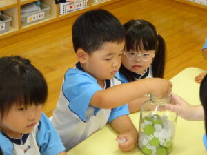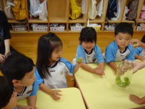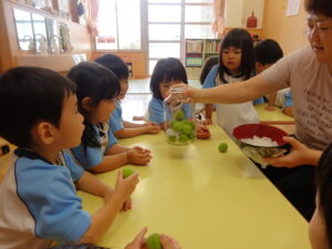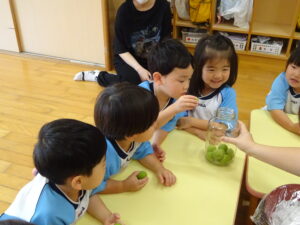 2025.07.05 こあらさんの梅仕事🐨 6月中旬。この日は、こあら組さんで梅仕事。梅の実を1人ひとつずつ手に取り、くんくん「どんなにおいがするかな?」とにおってみる子どもたち。先生と一緒に瓶の中に氷砂糖と合わせて入れていきます。さぁ、ここから、どうなるかな~??楽しみだね。 < 前の記事へ | 次の記事へ >
