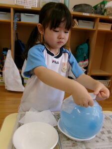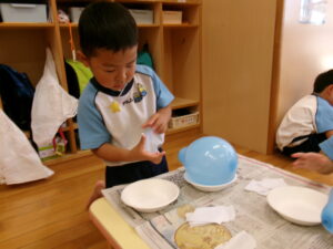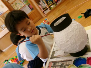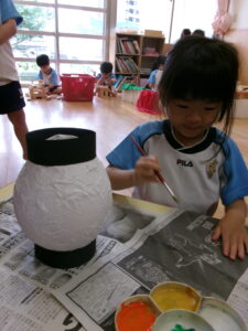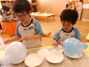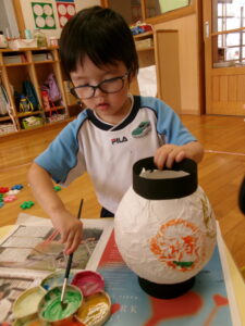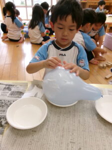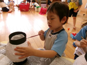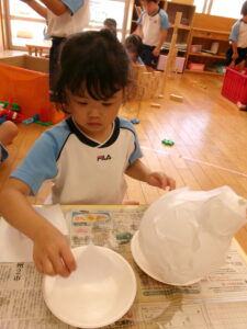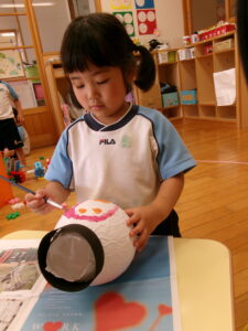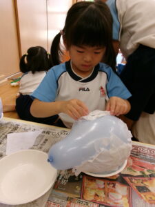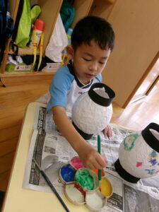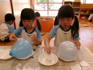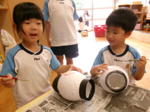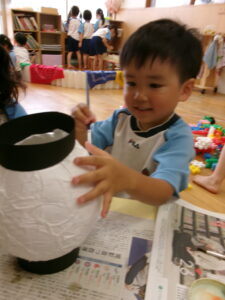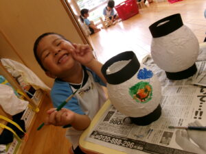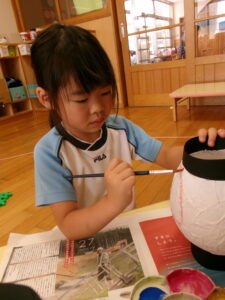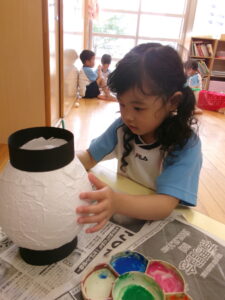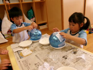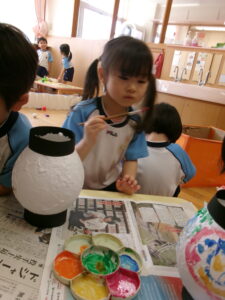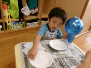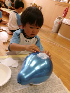 風船に紙をペタペタと貼っていき、乾かしたら絵の具で絵を描いていきます。もうすぐもうすぐ、楽しみな「夏祭り」です☆
