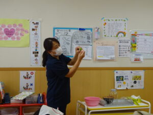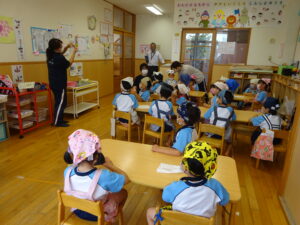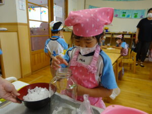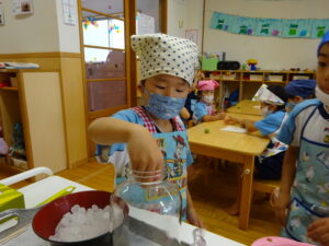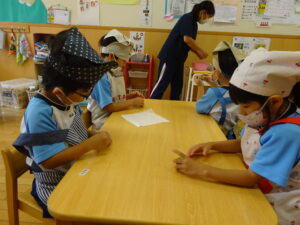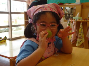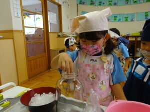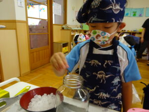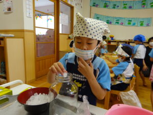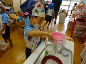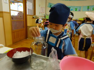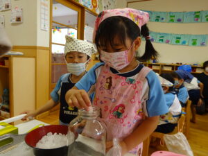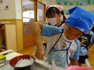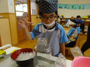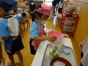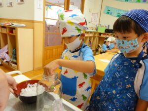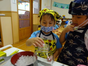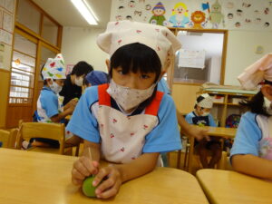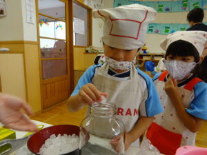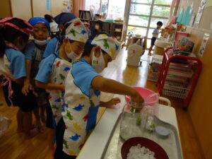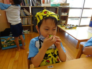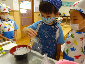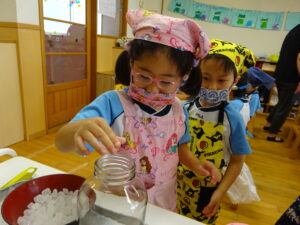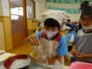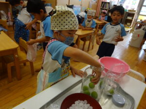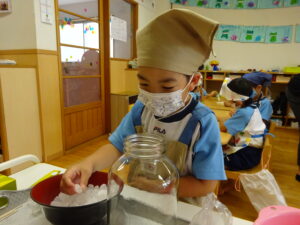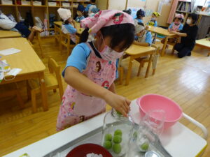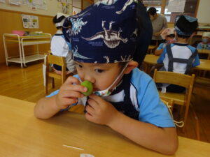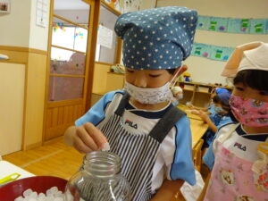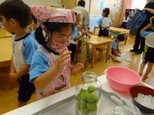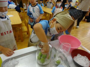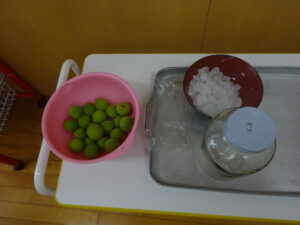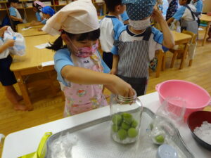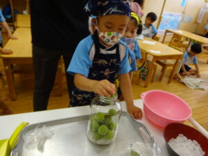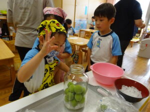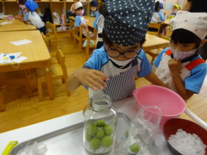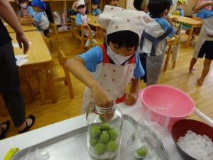 6月中旬。ぞう組さんの梅仕事の様子です。今年は年長さん、保育園で最後の梅仕事。しっかりにおいをかいでから、へた取りもあっという間に終えて、順番に瓶の中へ…。おいしい梅ジュースができるかな?
