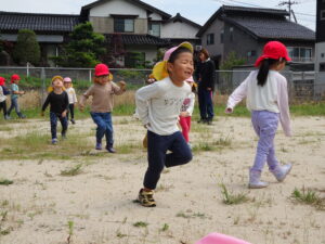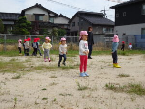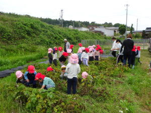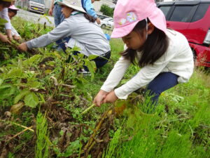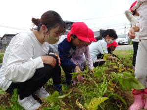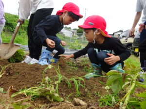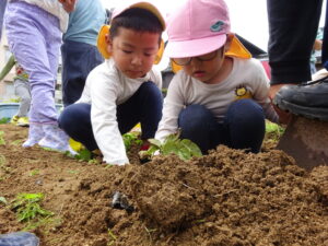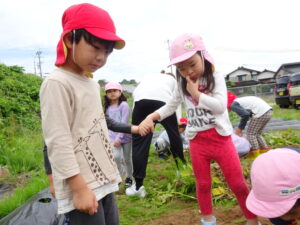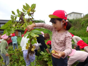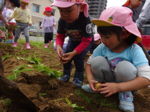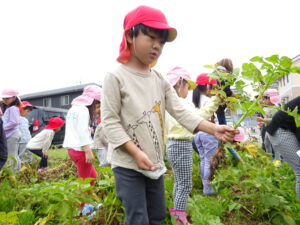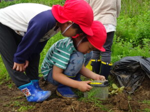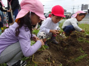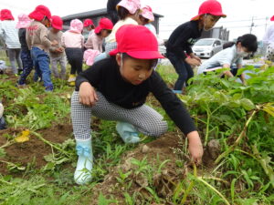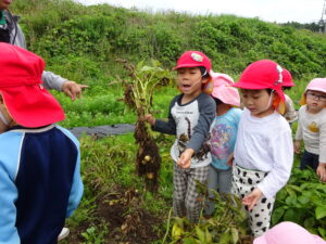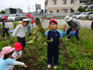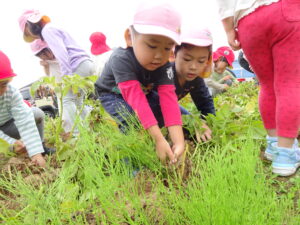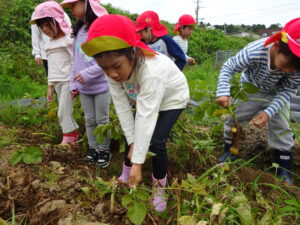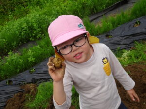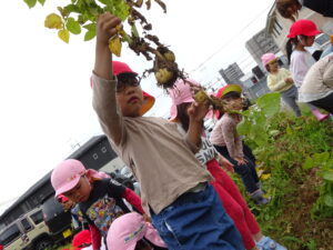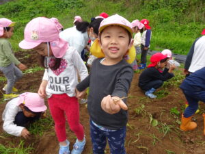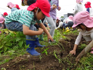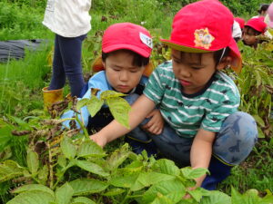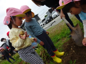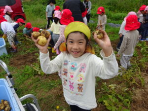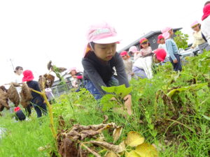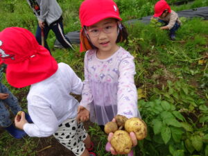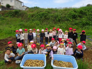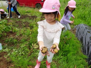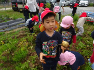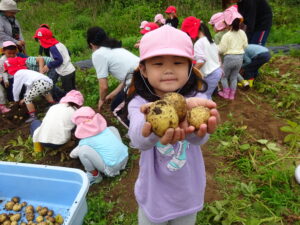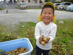 少し前になりますが、畑のじゃがいもを収穫しました。今年は芽が出るのも早く、葉っぱも生い茂り、土の中のおいもさんはどうかな~と思っていましたが、ちょっぴり小さめのじゃがいもさんがたくさん収穫できましたよ。土の中を掘って、「あった!」「ここにもあった!」と嬉しそうに見つけていく子どもたち。収穫の後はきりん組さんとぞう組さん一緒に第2園庭で遊べて、大満足でした(^-^)