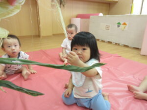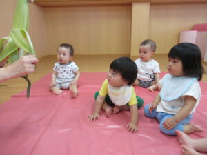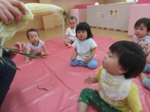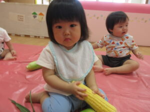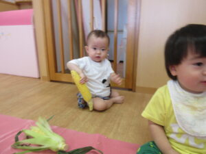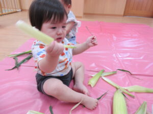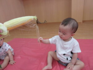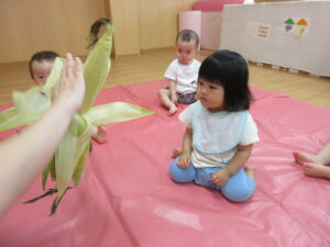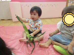 2025.07.10 とうもろこしさん🌽🐣 みてみて。これ、なんだろう?皮をむきむきすると…とうもろこしさんだよ🌽おひげもあるね。触ってみよう!むいたとうもろこしさんは、次の日、給食先生がとうもろこしごはんにしてくれました🍚 みててね。皮むきむきするよ。 なにか、出てきたね。 じゃ~ん、おひげさんだよ。 触ってみよう! おひげさん、どう? 長いね~。 皮、むきむきしてみよう! とうもろこしさんだね🌽 < 前の記事へ | 次の記事へ >