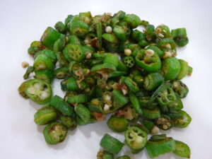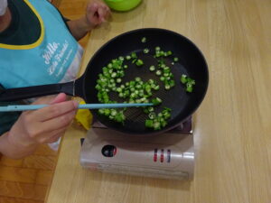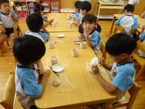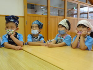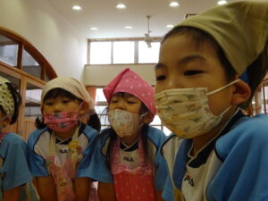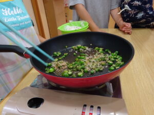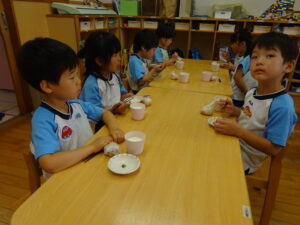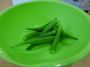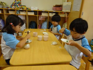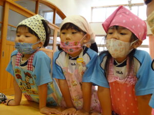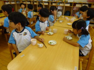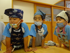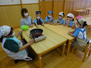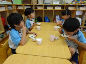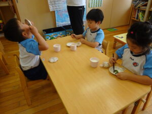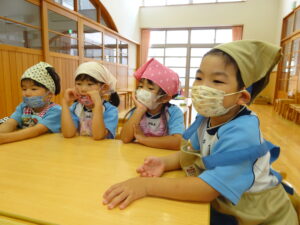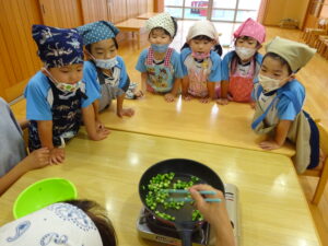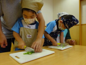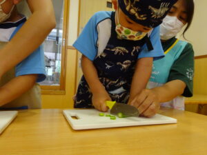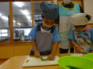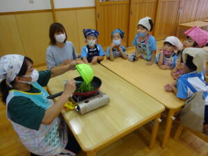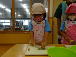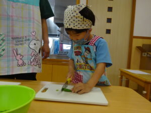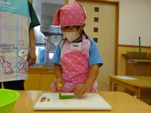 オクラを収穫したので、炒めて食べよう!ということで、この日は6人のお友達でクッキング♪包丁を使ってオクラを切ることに挑戦しましたよ。ざくざくという音を立てて、しっかりと切っていました。切ったオクラは先生がフライパンで炒めてくれました。時々オクラがパチっとはねると「オクラが踊ってる♪」と子どもたち(^-^)ねばねば~とオクラが糸を引く様子も喜んで見ていました。おやつの時間に、ぞう組さんみんなで食べましたよ。