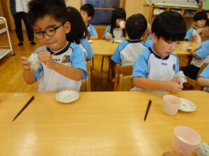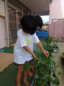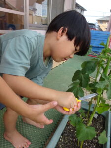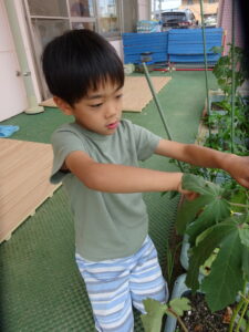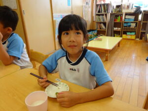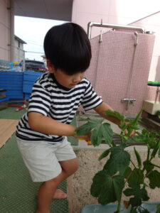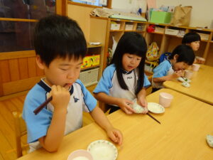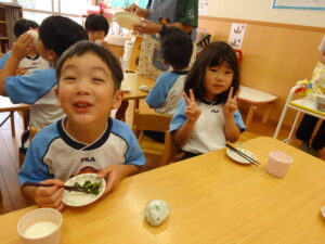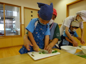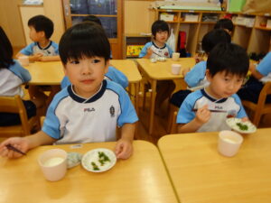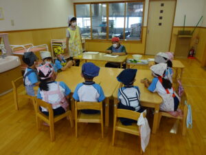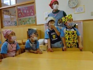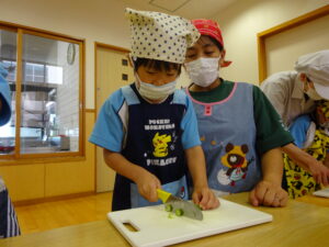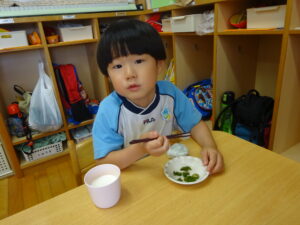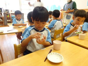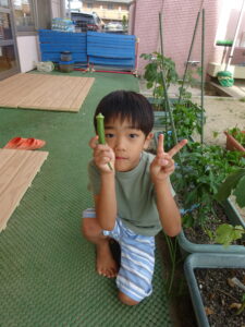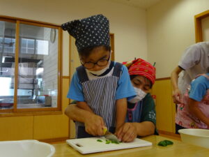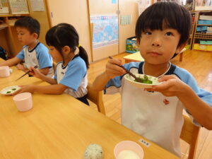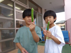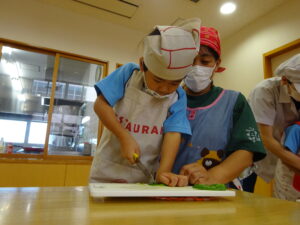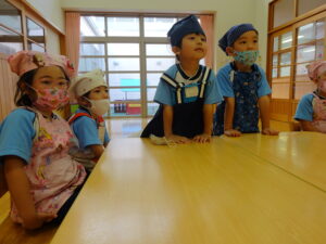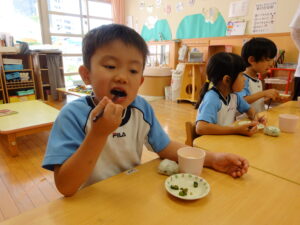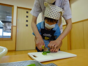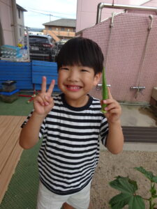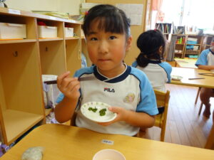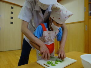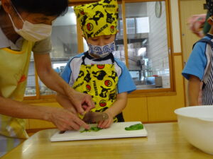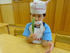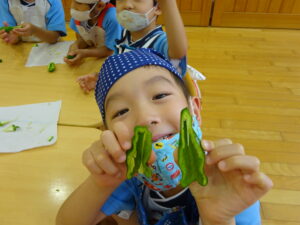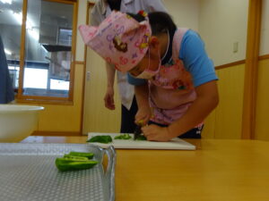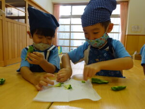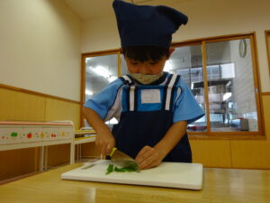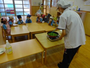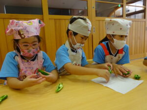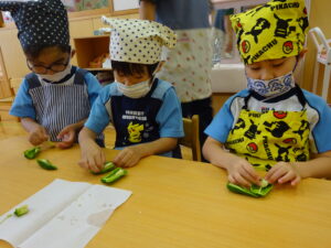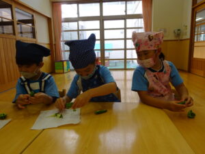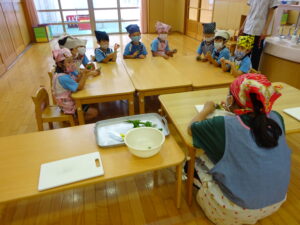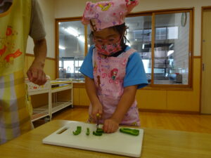 夏野菜がどんどん収穫を迎えています。この日はオクラとピーマンの炒め物。ピーマンを半分に切って種を取ると「何個あるかな…?」と数えてみるぞう組さん。一人ずつ包丁でピーマンとオクラをザクザクと切り、給食先生に目の前で炒めてもらいましたよ。ジュ~と焼けていく音や、しょうゆをたらした時のいいにおいなど、見たり聴いたり嗅いだりしながら楽しみました。そして、お部屋では、ぞう組さんみんなでしっかりと味わいましたよ(^-^)