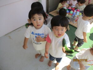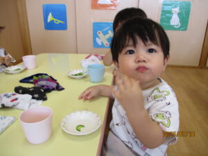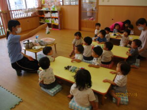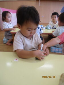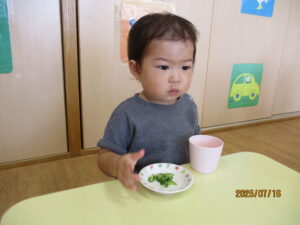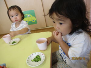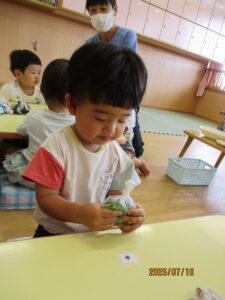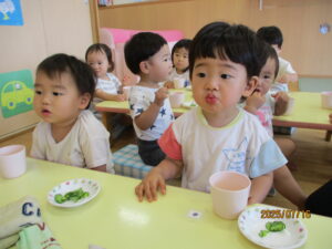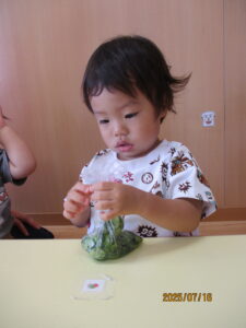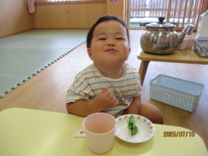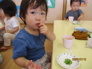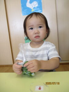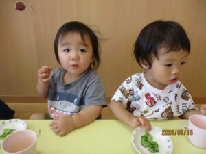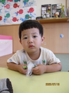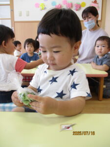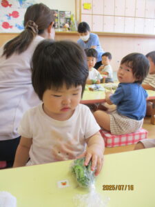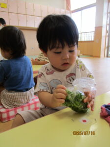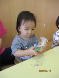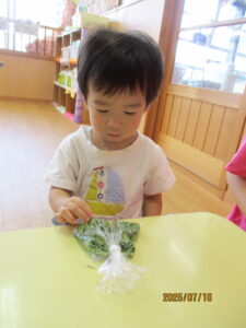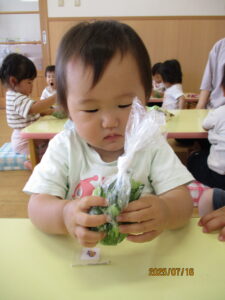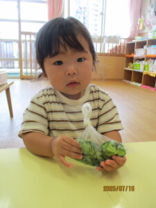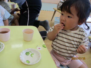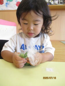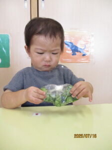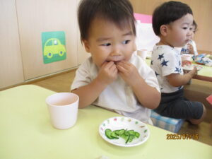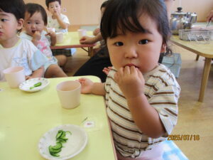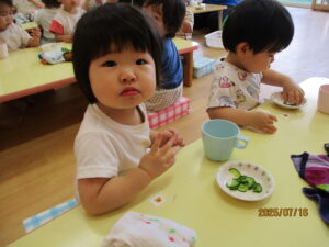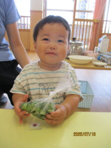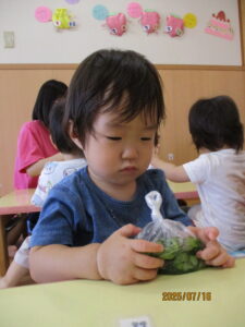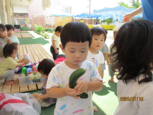 2025.08.02 🥒きゅうりさ~ん🐿 プランターで育てていたきゅうりを収穫しました。みんなでもみもみして、食べましたよ。きゅうりさん、かりかりしておいしかったね🥒 触ってみよう!どうかな? バナナみたいだね。 お塩を入れてもみもみしよう! もみもみ~ 食べてみよう!ぱくっ! 食べてみようかな~、やめとこうかな~ おいしいね! 「かりかり」いい音がするね~ < 前の記事へ | 次の記事へ >