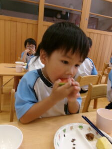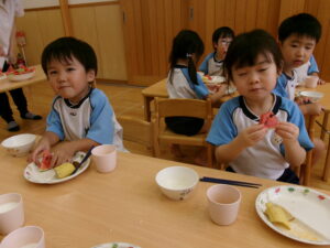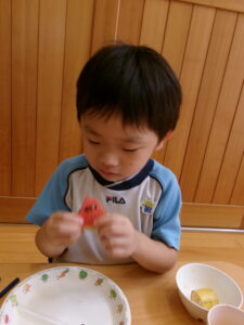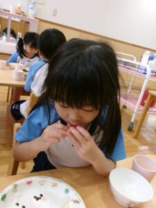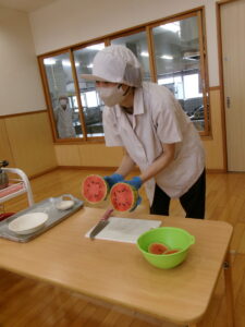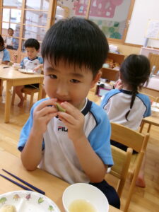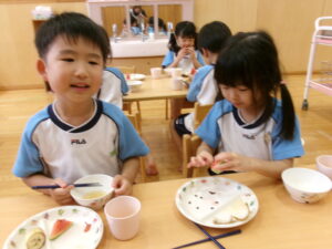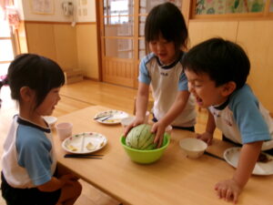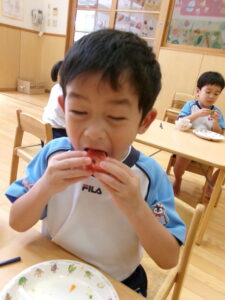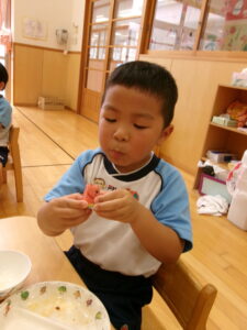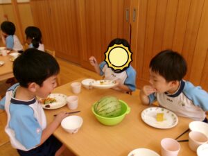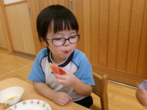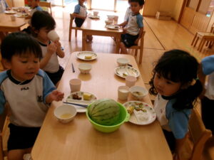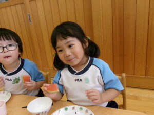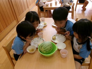 2025.08.02 🍉すいかさ~ん🦒 きりん組さんが育てていたすいかを収穫しました🍉今年度、保育園で1番大きく育ったすいかです。給食の時間に給食先生が目の前で切ってくれました。ぱっか~んと切ってもらい中身をみせてもらうと「おぉ~!!👏」と大歓声✨「種の色がいつものすいかと違う!」と気づいて教えてくれたきりん組さん。にこにこ顔でおいしそうに食べていましたよ(^-^) 大きなすいかだね🍉 中身は何色かな…? 触ってみようか。 ぱっか~ん!! < 前の記事へ | 次の記事へ >