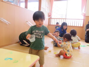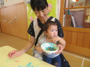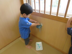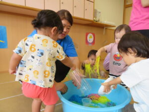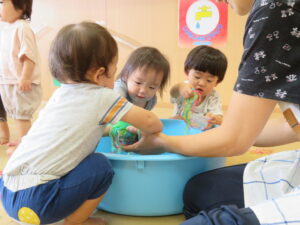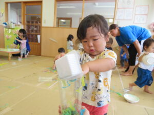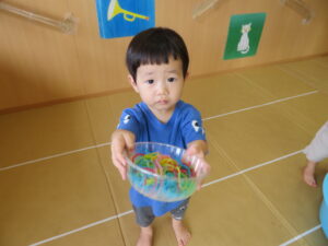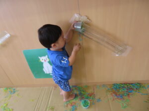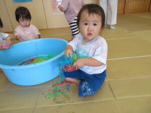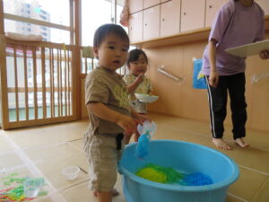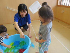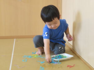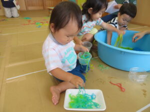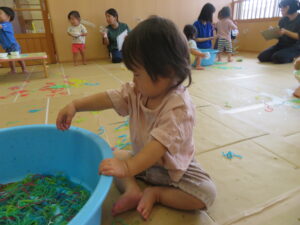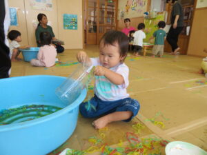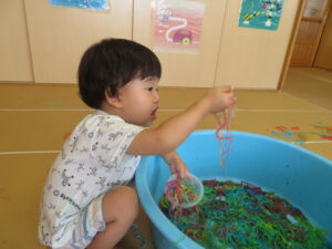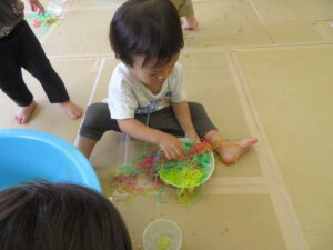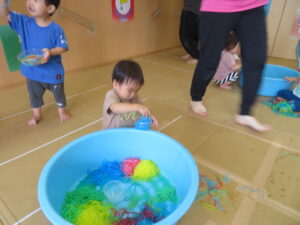りす組さんがとってもおもしろそうな遊びをしているので見に行ってみると…はるさめと葛切りで遊んでいました✨よ~く冷えた葛切りを触って「つめたっ!」と子どもたち。遊んでいると気持ちよくなってきて、たくさん手に握ったり、容器に移したりして遊んでいました。壁にはペットボトルの筒があり、はるさめを流してみようと試行錯誤…筒の中をはるさめが通り抜けるとにこ~(^-^)っと、とっても嬉しそうでした。感触遊び大好きなりす組さん、あっという間に時間が過ぎてしまうくらい、しっかりじっくり楽しんでいましたよ。