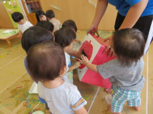 お片づけはりんごさんのお口へ…「どうぞ」