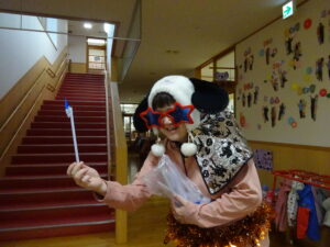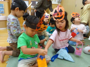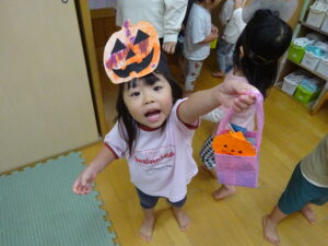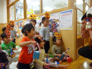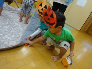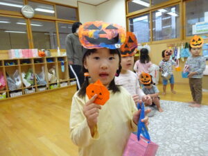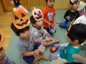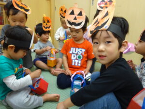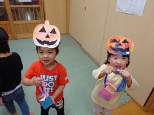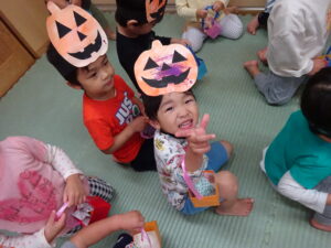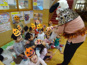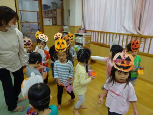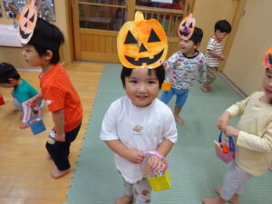 2025.11.14 happyHalloween🎃(うさぎ組) うさぎ組さんもハロウィンしました!!手作りのお面をかぶって、まずはお部屋でハロウィンを探そう(^-^)あんなところや、こんなところにハロウィンが隠れていて、探して集めて楽しみました。1階に下りてくると…主任先生が仮装してお出迎え☆みんなで大盛り上がりでしたよ。happyHalloween🎃 < 前の記事へ | 次の記事へ >