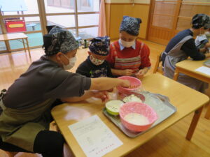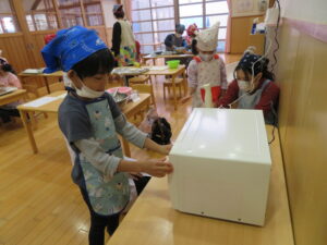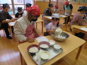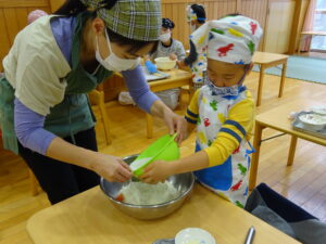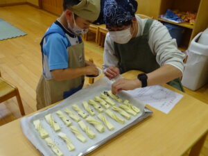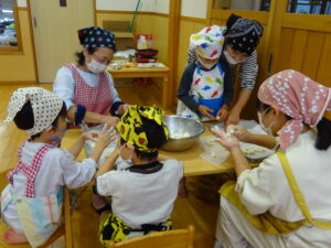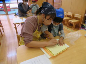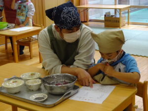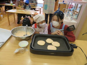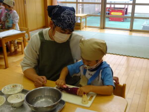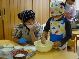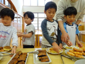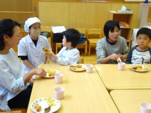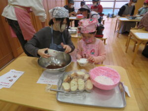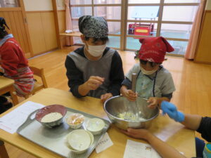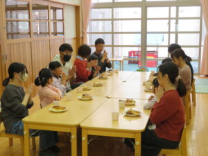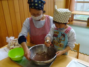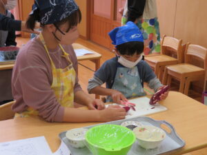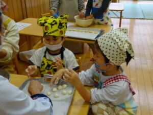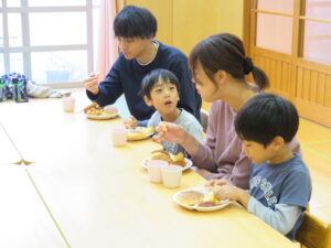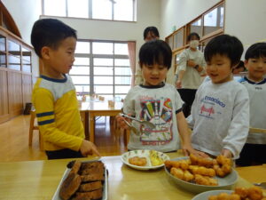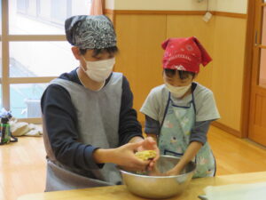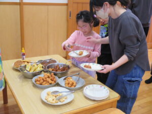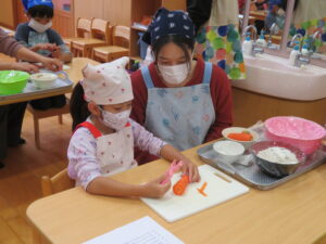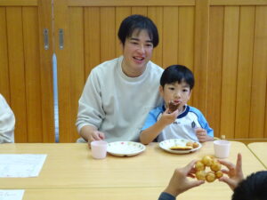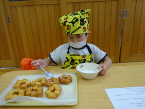 11月8日、親子おやつクッキングを行いました。午前の部と午後の部に分かれて、保育園で食べているおやつをお家の方と一緒に作って食べました。それぞれに色々なおやつを作って最後にみんなで試食もしましたよ。アメリカンドッグ、ポンデリング風ドーナツが人気でした!レシピ集を玄関に置いていますので、ご自由にお持ち帰りくださいね。参加していただいた保護者様、ありがとうございました。