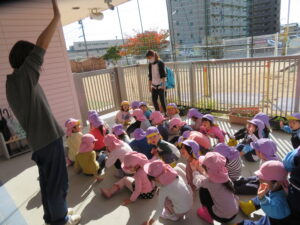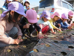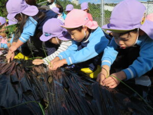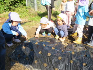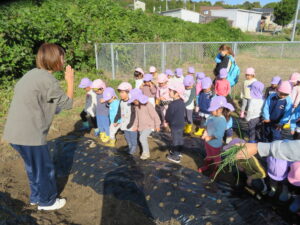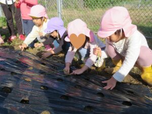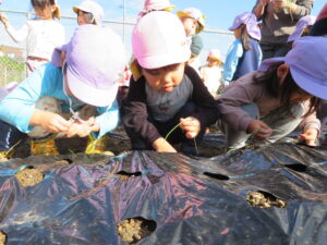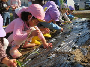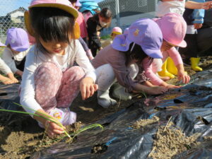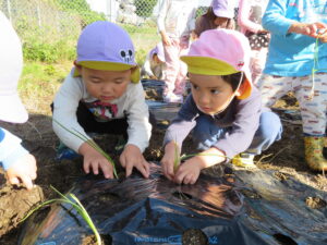 おいもほりをした畑に、今度は玉ねぎを植えに行きました!来年、大きくなることを楽しみに…こあら・きりん組さんで植えに行きました。小さな小さな赤ちゃん玉ねぎを、そ~っと優しく植えてあげていました。みんなといっしょに大きくなろうね、玉ねぎさん☆