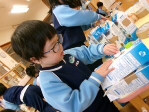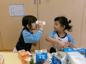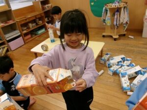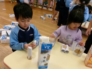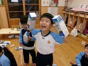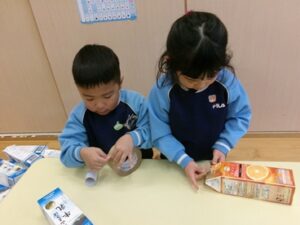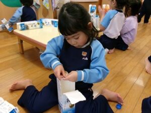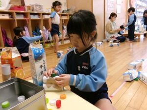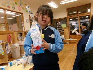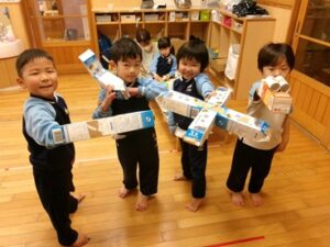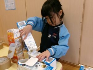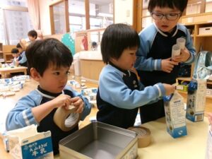 きりん組さん。この日は牛乳パックやペットボトルのキャップ、ラップやトイレットペーパーの芯などの廃材で遊びました。くっつけたい時はクラフトテープを使います。手でちぎるのも遊びの中で経験しながらだんだんとコツをつかんでいましたよ。