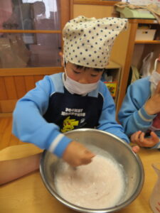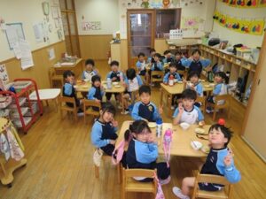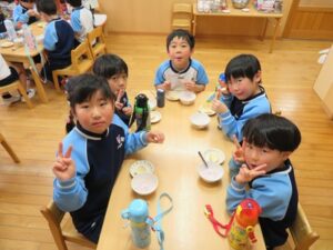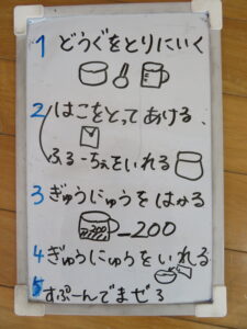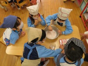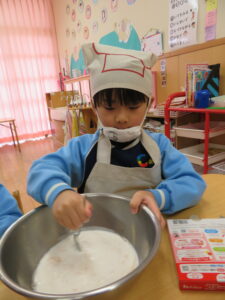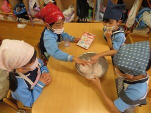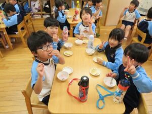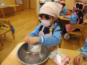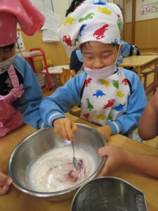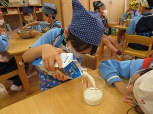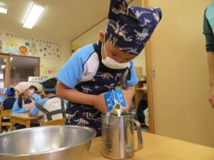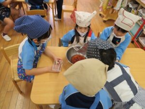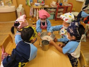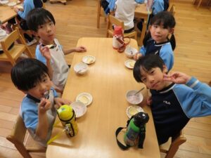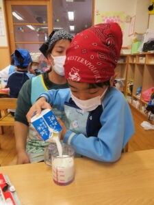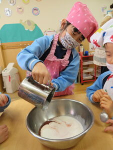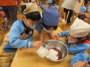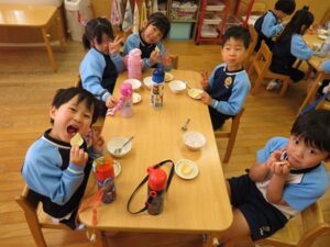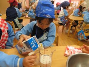 お楽しみクッキング♡フルーチェ作りをしましたよ(^_^)1人に1つ役割があり、袋を開けたり、ボールに入れたり、牛乳を計ったり…お友だちが作っている時も自分の役割を楽しみにしながらすることができました。そしてお友だちと協力して、それぞれのグループごとにフルーチェが完成!近所の方からいただいたお菓子も一緒に、今日は特別のおやつパーティーでした♡