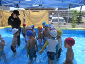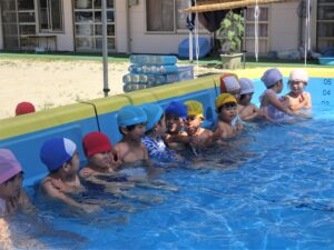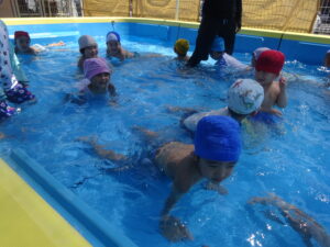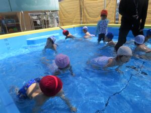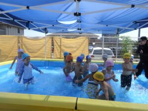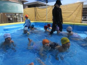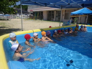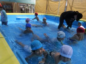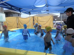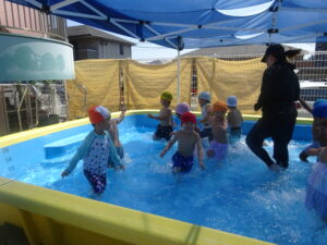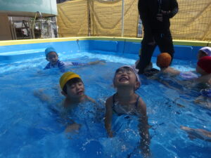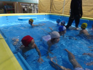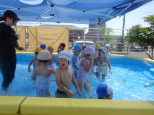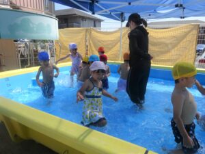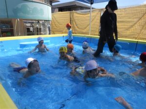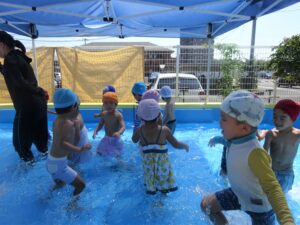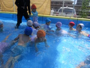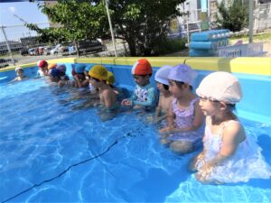 2023.08.01 プールで遊んだよ☆こあら組 毎日暑い日が続いていますが、気温とにらめっこしながらプール遊びを楽しんでいます。少しずつ顔にお水がかかってもへっちゃらなお友だちも増えてきましたよ(^-^)8月も引き続きプール遊びを楽しんでいきたいと思います。 まずは体にお水をかけていきます 気持ちいいねぇー♡ 顔にもお水をかけれるかな? プールを歩いてみよう! 次はワニさん歩きです じょうずにすすめるよ♪ たのしいねー♡ < 前の記事へ | 次の記事へ >