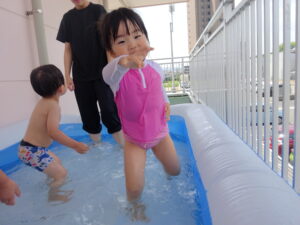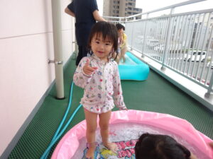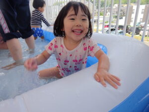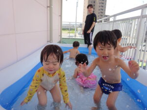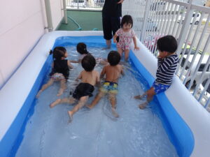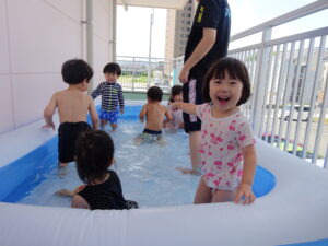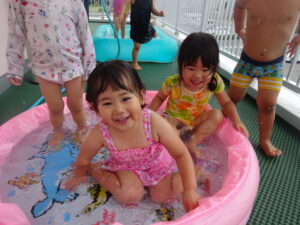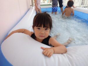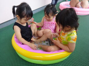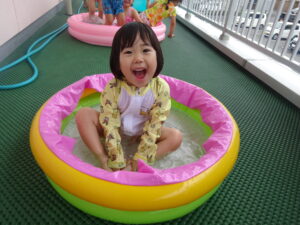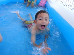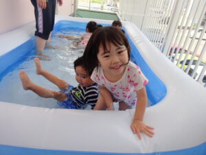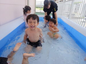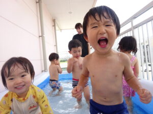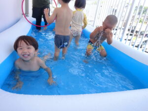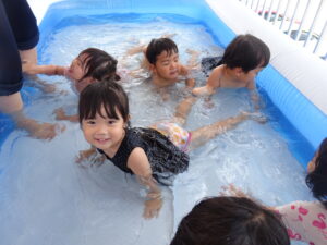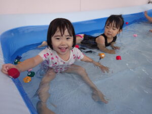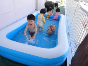 プール遊び、水遊びが大好きなうさぎ組さん。プールではフラフープをくぐったり、ワニさん歩きをしたり、スーパーボール拾いや金魚すくいをしたりして元気いっぱい水遊びを楽しんでいます!