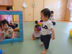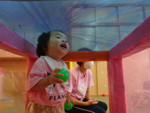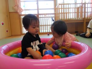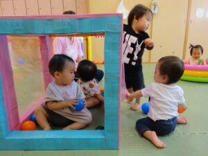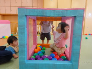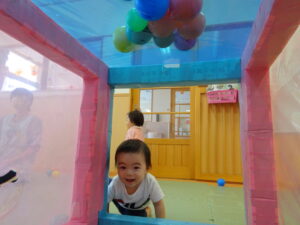 毎日暑い日が続いていますね…☀ボール遊びが大好きなひよこ組さん。この日はビニールプールやトンネルにボールを出し入れしたり、中に入って遊んだりしましたよ。安心できる先生たちとのやりとりも大好きな子どもたちです(^-^)