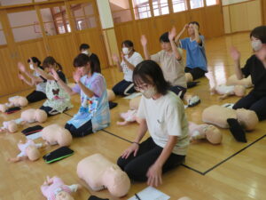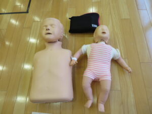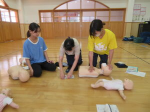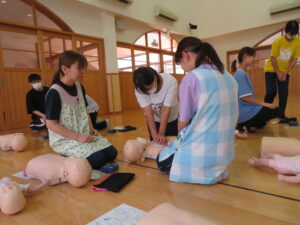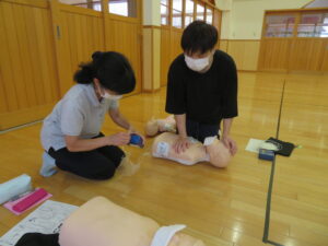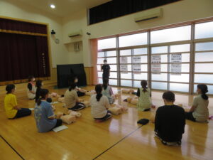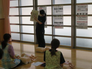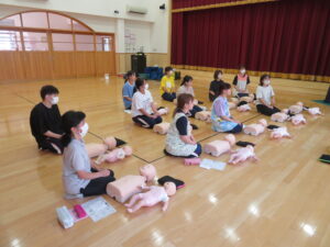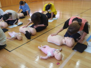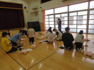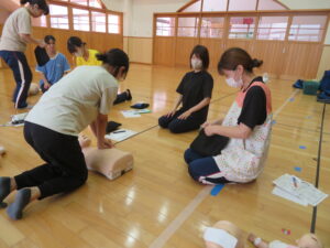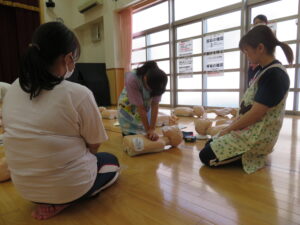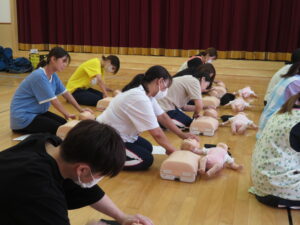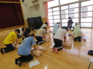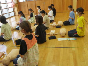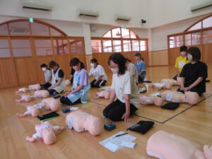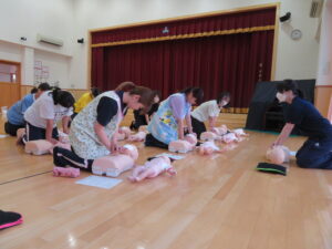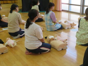 2023.08.10 救命講習を受けました(8/10) 今日は職員研修(救命講習)でした。保育園では毎年救命講習を受けています。消防署の方に来ていただき、心肺蘇生法(AEDの使用を含む)を確認します。救急車到着までの平均時間は8分!この間に私たちができることをくり返し体に覚えさせます。最後は3人1組になって実践的な練習もしました。 < 前の記事へ | 次の記事へ >