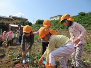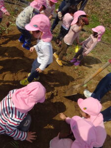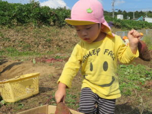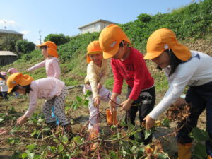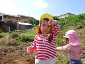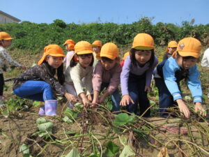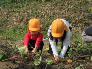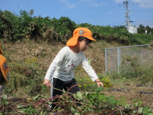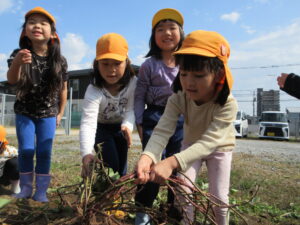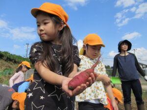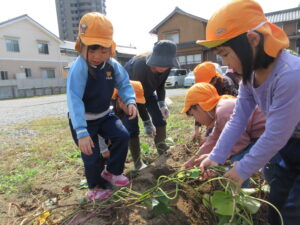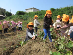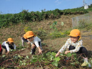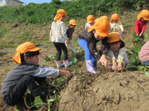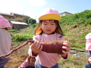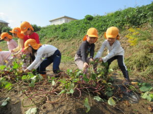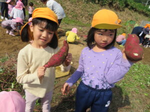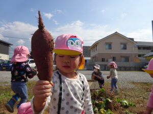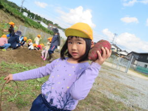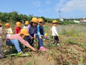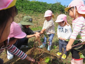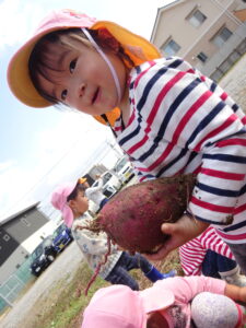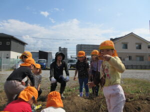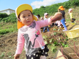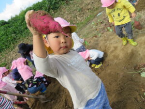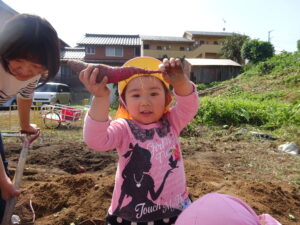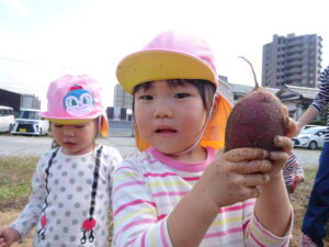 10月17日にうさぎ組~ぞう組のお友だちが保育園の畑でお芋ほりをしました。春に自分たちで苗を植えて育てたさつまいも。今年はとても大きく、しかも土の中の深~いところに育っていて掘るのが大変でしたが、お友だちと協力してつるを引っ張り、土の中まで掘って掘って、たくさんのさつまいもを収穫することができました。11月の焼き芋会でやきいもにして食べる予定です♪