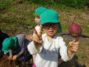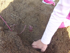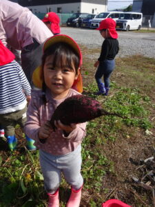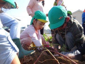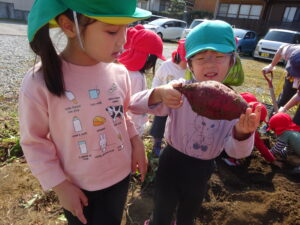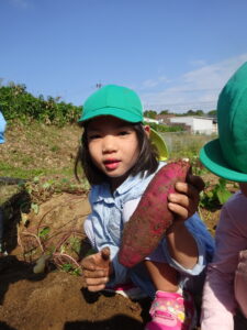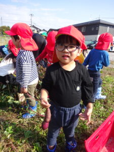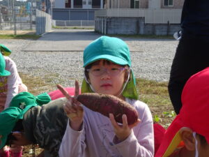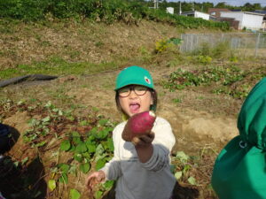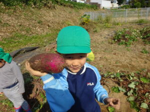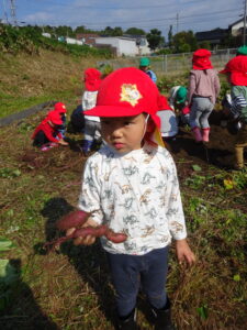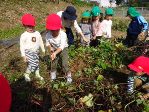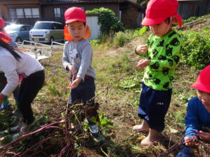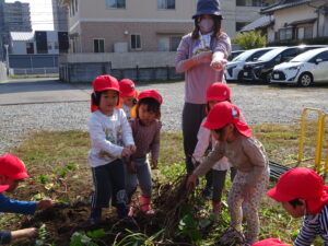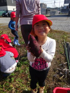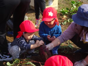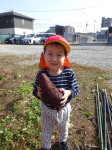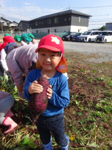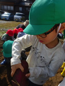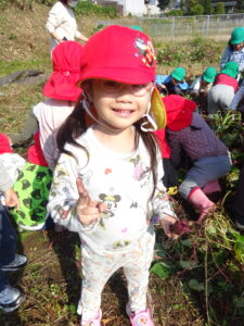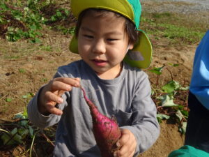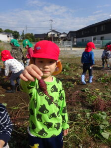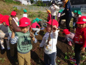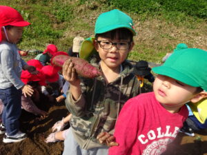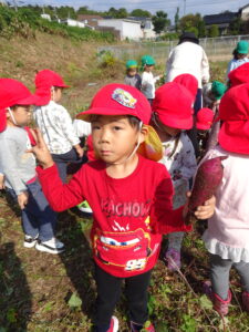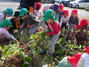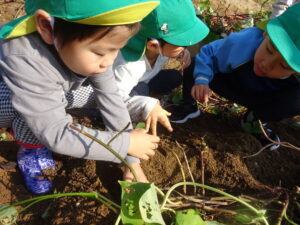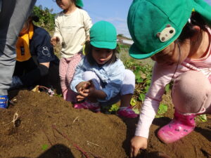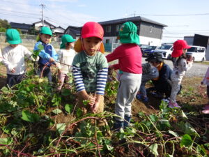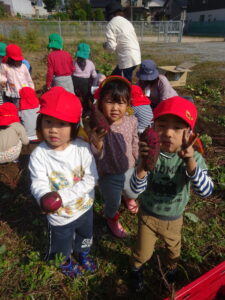 おいもほり、第2回戦!次はこあら組さんときりん組さんです。きりん組さんがこあら組さんをリードして歩いてくれました。おっきいおいも掘るぞ~!!