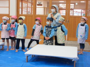 こどもたちもエプロンと三角巾をつけて参加します