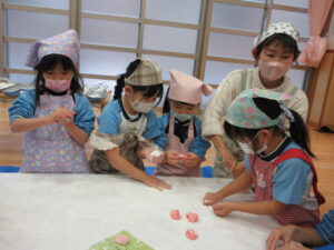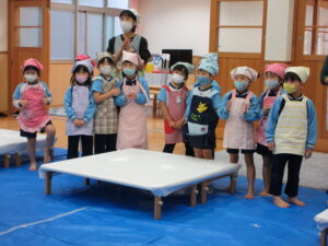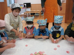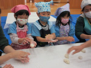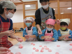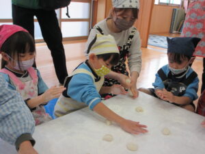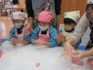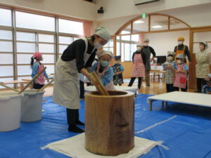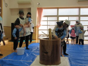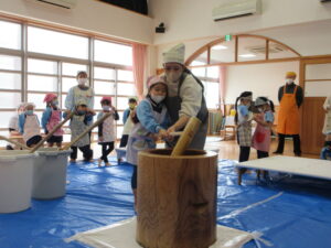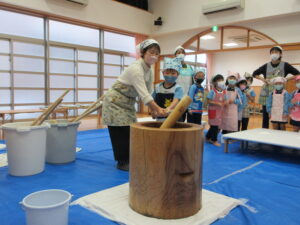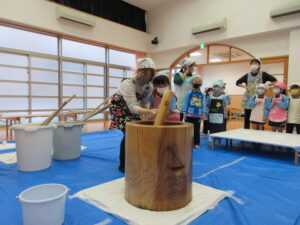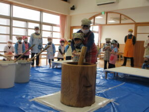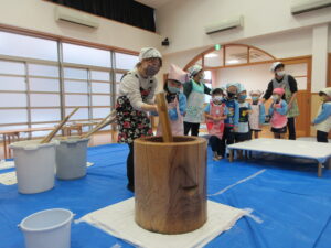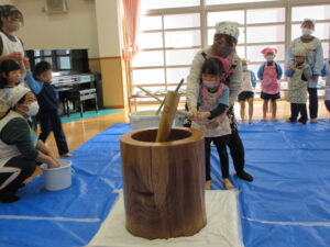 前日子どもたちが洗ったもち米を給食先生に蒸してもらって、この日はいよいよもちつき会です!!保護者の方にもお手伝いでご参加いただき、子どもたちと一緒におもちをついたり丸めたりしていただきました。「いいにおい!」「ふわふわしてる~」「あったか~い」「おもちがてにくっつくー」とおもちつきを楽しむ子どもたちでした♪お手伝いしていただいた保護者様、ありがとうございました。