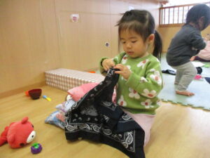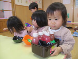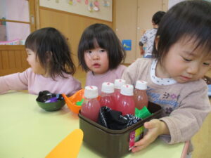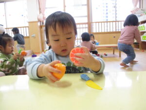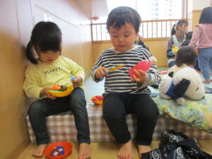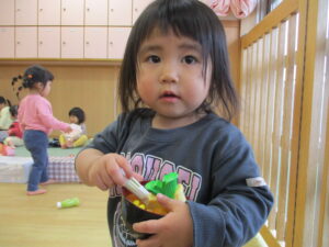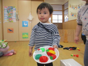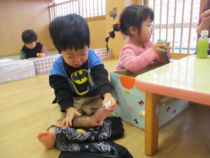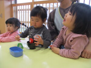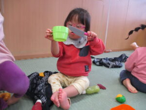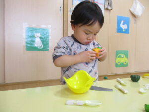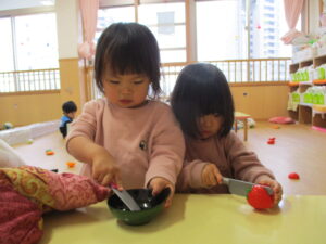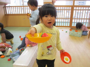 2024.02.01 ままごと遊びをしたよ☆りす組(1/31) お部屋でままごと遊びをしました。4月には一人でもくもくとご飯を作っていたりす組さんでしたが、遊び方も少しずつ変わり、色々なものに見立ててお料理をしたり、「かーしーてー」「いーいーよー」とお友だちとの貸し借りをしたり、お友だちと仲良く並んでお弁当作って食べたり…お友だちと一緒に遊ぶことを楽しんでいましたよ🎵 < 前の記事へ | 次の記事へ >
