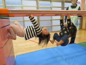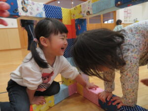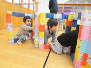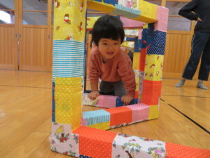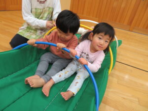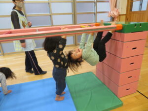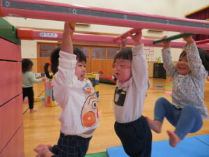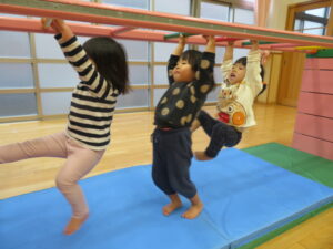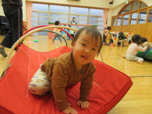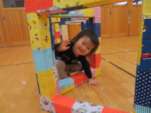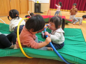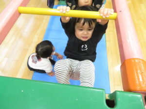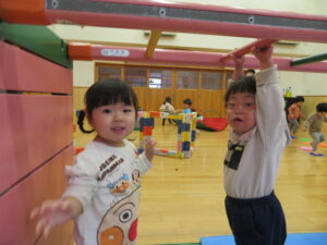 遊戯室で運動遊びをしました。巧技台とはしごを組み合わせた遊具に夢中な子どもたち。足をじょうずに上にあげて、ぶら下がることを楽しむお友だちもいましたよ!マットにみんなで並んで座り、「バスで~す!」とフラフープをブラブラする可愛い姿も見られました💛保育者手作りのトンネルもたくさん遊んでくれて嬉しかったです☆また遊戯室で遊ぼうね!