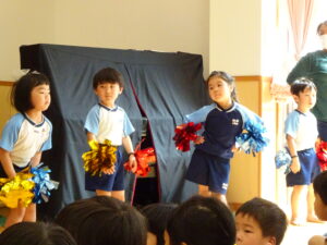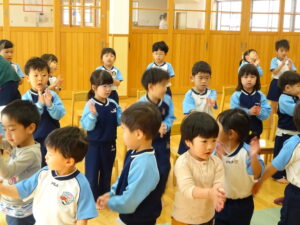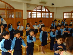 4月3日(月)に入園進級お祝い会がありました。園長先生のお話を聞いた後、みんなで歌を歌ってお祝いをしたり、ぞう組さんが踊りを披露してくれたりしましたよ。元気いっぱいやる気いっぱいの子ども達です♪♪