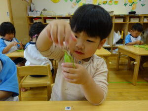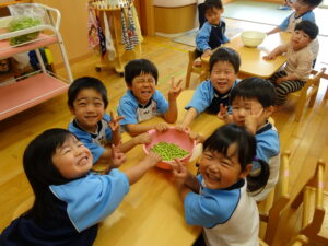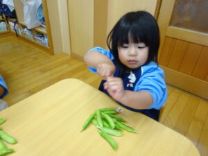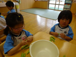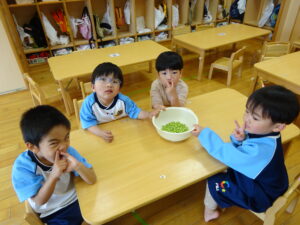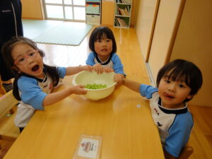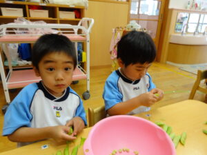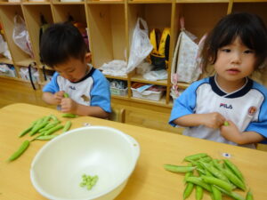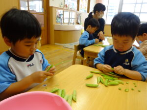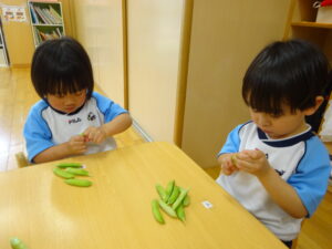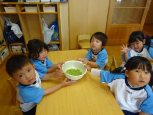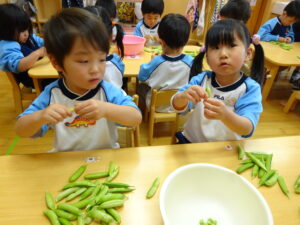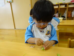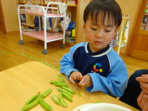2023.05.02 お豆をだしたよ(グリンピース)こあら組☆ グリンピースのさやだしをしました。とっても真剣なこあら組さん。ときどき、お豆さんが元気すぎて「ぴょ~ん」と飛んでいってしまったり…なんてこともありつつ、お部屋が春のにおいでいっぱいになりました。今日のお豆は、給食先生がお豆ごはんにしてくれます☆ < 前の記事へ | 次の記事へ >