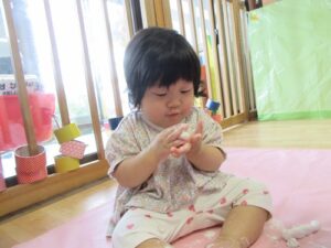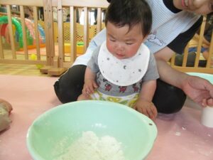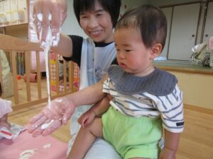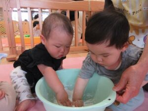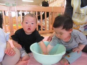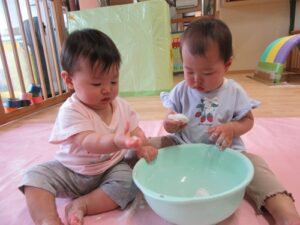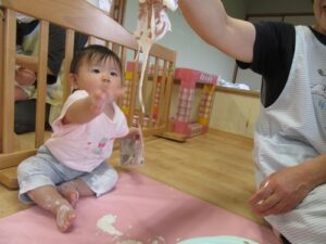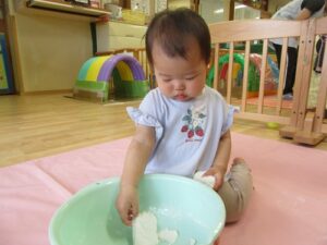 2025.06.03 さらさら つんつん これなあに?(ひよこ組) 今日ははじめての「米粉あそび」 “なにがはじまるの?”と先生の顔をじーっと見る子どもたち。 サッと手を伸ばす子や険しい表情でじーっと見る子…様々な表情を見せてくれるひよこ組さんです♡ これ、なあに? さわってみると… えっ!?サラサラしている! つんつん… なんだろう… とろとろ~ わあ! さわりたい! ころころ… せんせい、どうぞ♡“はじめて”がいっぱいだったね☆また遊ぼうね♪ < 前の記事へ | 次の記事へ >