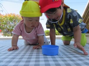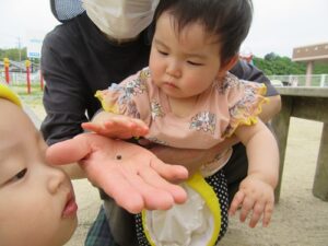 2025.06.12 ぽかぽか おそと きもちいいね♡(ひよこ組) 春の風とともに穏やかな時間が流れているひよこ組さん。 お外では、先生と目を合わせ笑顔を見せたり、“これ、なあに?”と興味を持ったりと少しずつ行動範囲を広げているひよこ組さんです♪ あ… トマト…? これ、なあに? お…!? ん!? みつけた♡ そーっと、そーっと わくわく♡ たくさん遊んだ後は… おひるねタイム♡ すやすや…どんな夢を見ているのかな♡? < 前の記事へ | 次の記事へ >