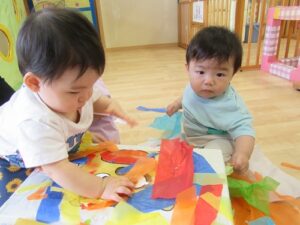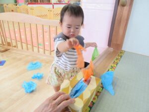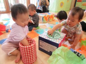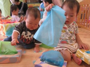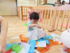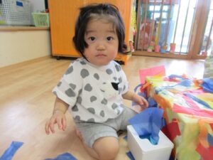 2025.07.24 ひらひら でてきた お花紙【ひよこ組】 今日は、お花紙で遊びました☆ ティッシュ箱に入ったお花紙と段ボールにたくさん貼ってあるお花紙♪ 引っ張ってみることに夢中で真剣な表情のひよこ組さんです🐣 おっ!? 引っ張ってもまだまだ出てきた… これはなんだろう? びりびり… 何が入っているのかな… 周りはお花紙でいっぱいに…♡“たのしい♪”を見つけたね☆ < 前の記事へ | 次の記事へ >