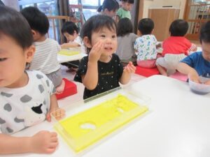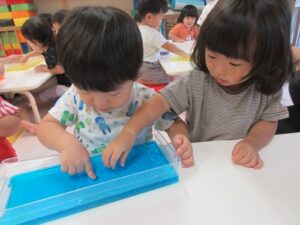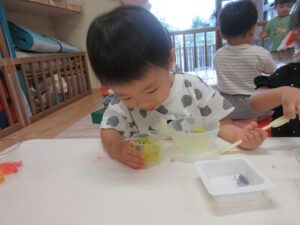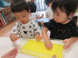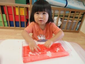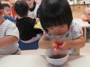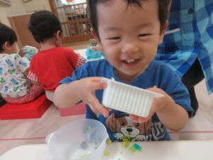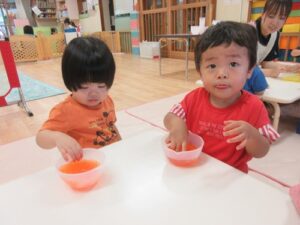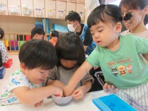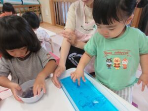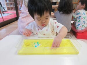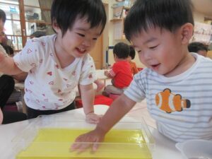 寒天とはちょっぴり違う感触を手に触れて感じながら、みんなで夢中になって遊んでいました♪