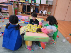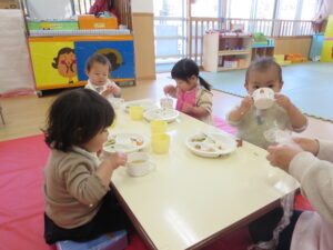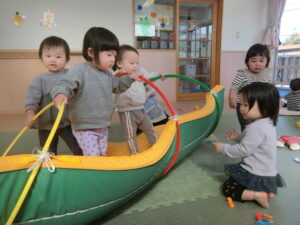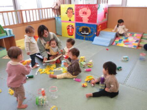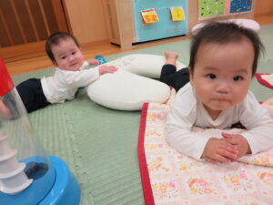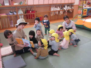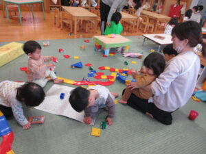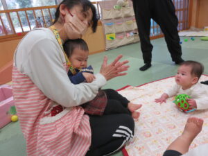 お部屋で先生の手遊びや歌をきいたり、先生やお友だちと一緒に遊んでいますよ♪