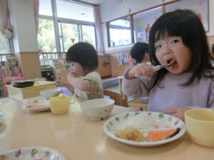 たくさん遊んだ後は、おいしい給食を食べて元気モリモリになっています😊✨