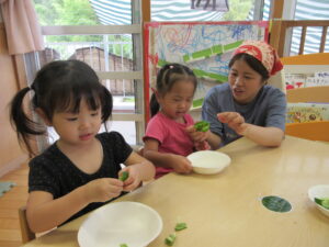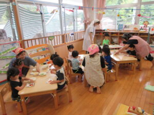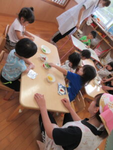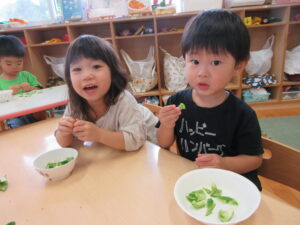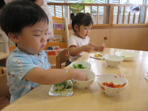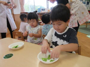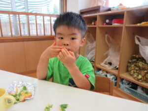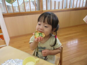 今年の夏、野菜作りに挑戦した2歳児さん。園庭で育てていたピーマンが大きくなったので、みんなで餃子の皮を使いピザ作りをしましたよ~!ピーマンに触れてみると「わっなんかかたいね~」「みどりのにおいがする~!」と発見がいっぱい。子どもたちのかわいいつぶやきを聞きながら一緒に楽しみました。