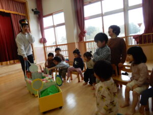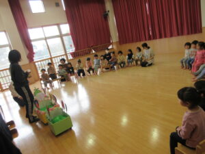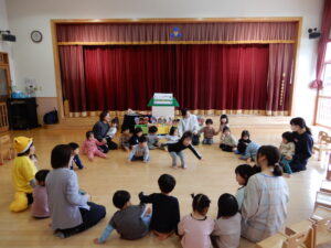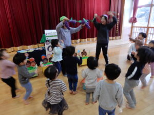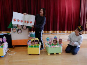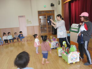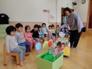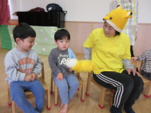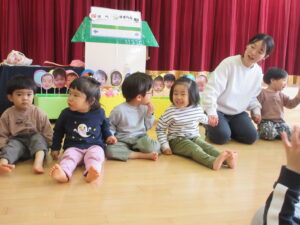 だるまさんの絵本、何回も見たね~!「うんとこしょっ!」と力を合わせてお芋掘りもしたね🍠。おおかみさんやきつねさんといっぱい遊んで楽しかったね!