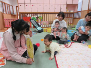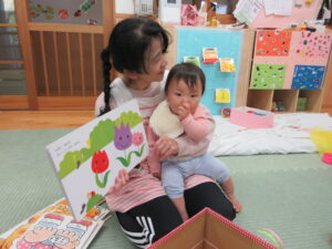 2024.04.19 入園おめでとうの会(いちご組) 4/19(金)今日は0歳児のいちご組さんが≪入園おめでとうの会≫をしました。先生や保育園での生活にも少しずつ慣れて“だっこして~”と手を伸ばしたり、目が合うとにこ~と笑ったりとかわいらしい仕草や表情を見せてくれますよ。 ちょうどスヤスヤと気持ちよさそうに寝ているお友だちもいましたが、チューリップの歌をうたったり、いないいないばあ!のペープサートを見たり、、穏やかな雰囲気のおめでとうの会でしたよ🌷 < 前の記事へ | 次の記事へ >