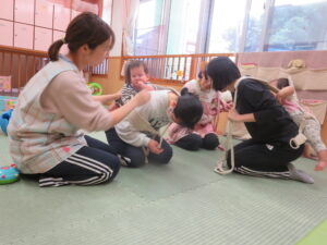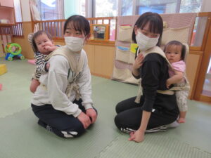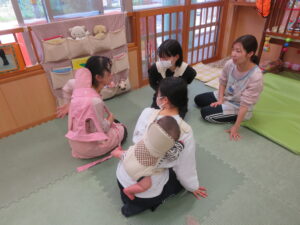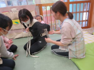 今年度の新任の保育士と栄養士の先生が、おんぶの練習をしましたよ☺ゆっくり優しく先輩から手取り足取り教えてもらいましたよ♪