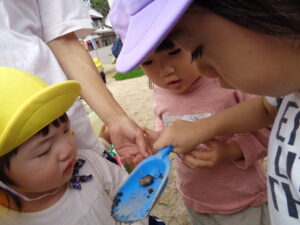 土の中から幼虫🐛発見!!「なんんだこれ~!」とのぞき込む姿が可愛らしかったです。