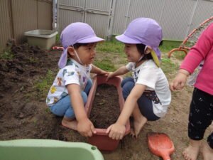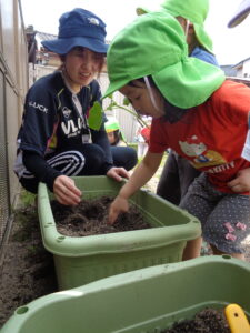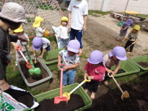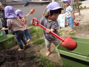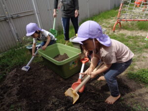 まずは土作り!興味がある子が集まってきて“なんだろう”と不思議な様子。先生たちの真似をして土に触ってみたり、スコップで掘ってみたりしていましたよ。