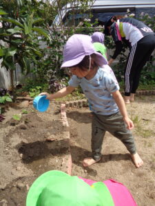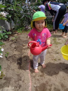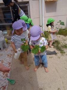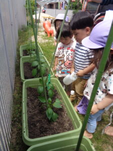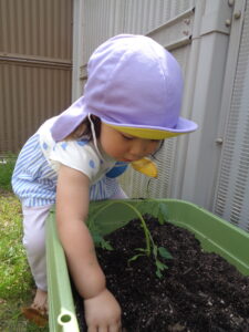 2歳児のぶどう組さんとめろん組さんが園庭で野菜の苗植えをしました。今年はトマト、ピーマン、キュウリの苗を植えましたよ。