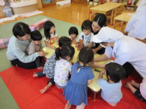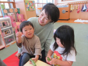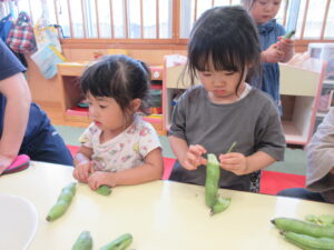 そらまめくんの絵本を見ていたぶどう組さんに、そらまめがやってきました♪「わっ!なんだこれ~?」と興味津々な子どもたち。「そらまめくんどこにいるかなぁ~?」とさっそくむいてみましたよ!