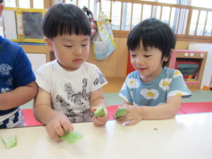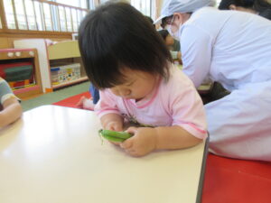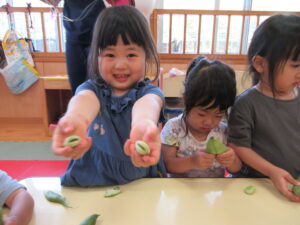 そらまめさんが入っていたさやを触ってみると・・・「わっ!ふわふわ!」「きもちがいいね~!」とそらまめさんのお布団を発見しましたよ✨出てきたそらまめさんは給食先生に「おねがいしま~す!」と美味しく湯がいてもらい、みんなで食べました♪野菜好きなぶどう組さん。そらまめもぱくぱく!と食べていましたよ。