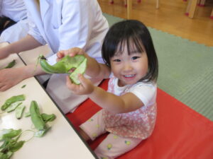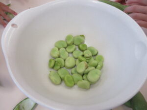 「あっ!そらまめさん!」「あった~!!」とうれしそうな声が・・・「そらまめさんでてきたね~!まだこっちにもいるかな?」と夢中でむいていましたよ。