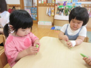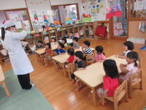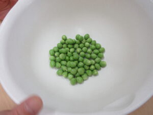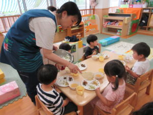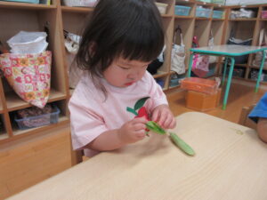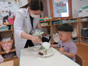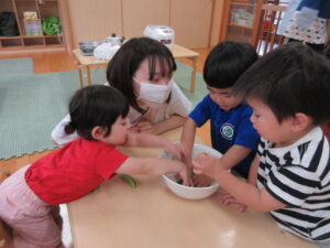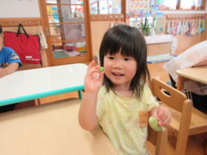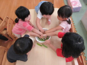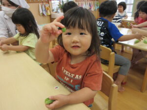 給食先生といっしょにお豆ごはんを作りました。みんなでグリンピースをむきむき・・・「あっ!おまめ!」と出てきたかわいい緑色のお豆にうれしそうな子どもたち。「もう一回する!」「お豆ちょうだい~」と次々にむいてましたよ♪