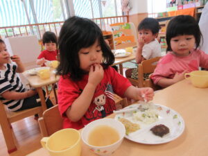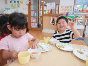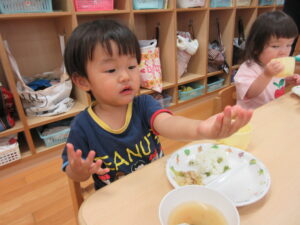 「おまめあったよ~」とグリンピースを見つけてぱくっ!と食べてみる子やお皿にお豆だけきれいに集める子・・様々な反応を見せながらたのしい給食タイムになりましたよ♪