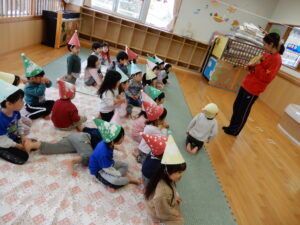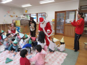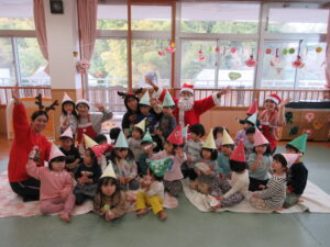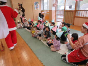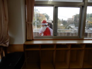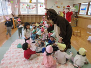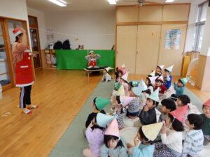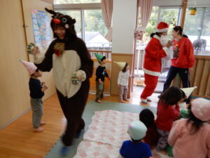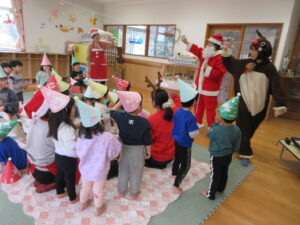 みんなで帽子を被ってから、歌や手遊び、絵本を見ていると何やら窓の外から鈴の音が聞こえてきました♪ 「あれ!誰かきたみたい!」と、みんなで窓を見てみると…「サンタさんだー!!」「トナカイもいる~」と子どもたち。