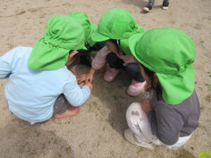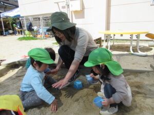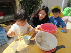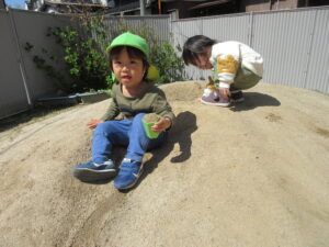 太鼓橋を登ったり、ダンゴムシを見つけたり・・砂の感触に触れて「わぁ~っ!」と嬉しそうな声が聞こえたり・・♪